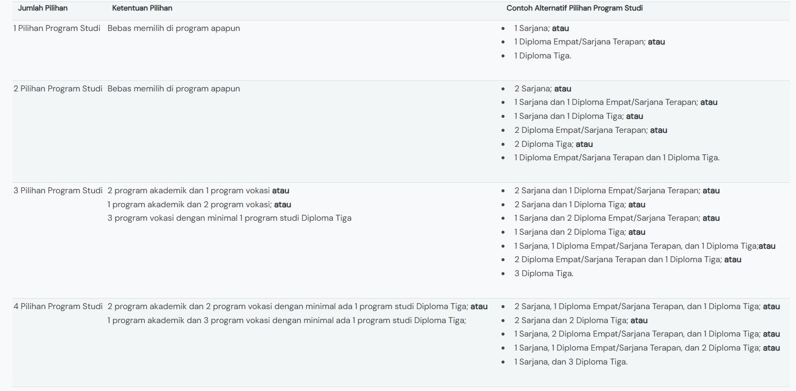 2. Setiap peserta diperbolehkan memilih maksimal 4 (empat) program studi yang terdiri dari 2 (dua) pilihan Program Akademik (Sarjana) dan 2 (dua) pilihan Program Vokasi (Diploma Tiga dan Diploma Empat/Sarjana Terapan) dengan ketentuan sebagaimana tabel terlampir.